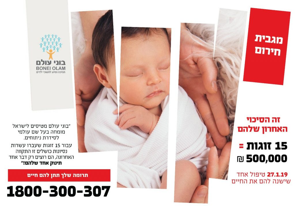 הזוגות דומעים אליכם ומתחננים לרחמכם. אנא! עיזרו להם ותנו לנו את היכולת להעמיד לרשותם את הסיכוי האחרון שלהם לזכות בילד שלהם!